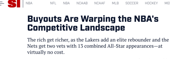 事实上,从表面上看是湖人篮网招募得到的强援,但据《体育画报》记者Howard Beck报道,一名小市场球队的总经理向他透露,很多中小市场球队都受到了来自球员经纪人的威胁,也就是说,包括骑士、活塞等球队都是感受到了来自球员的压力导致被迫买断,促使湖人篮网抢人成功的!