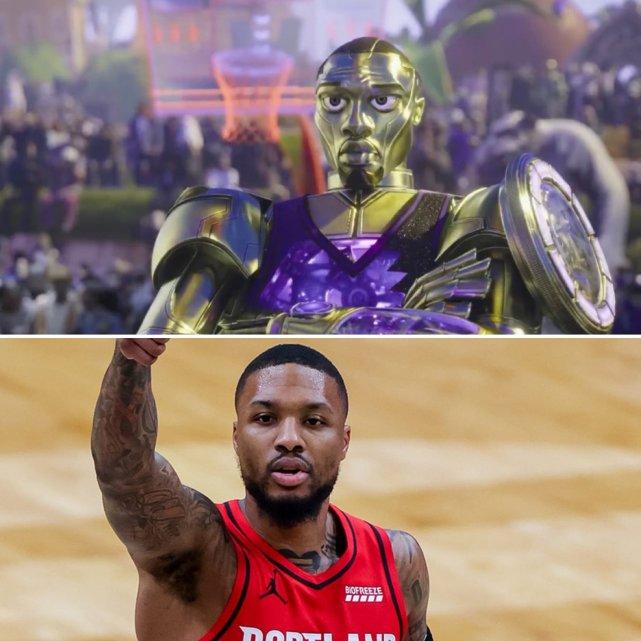 除了詹姆斯自己,利拉德、克莱-汤普森、浓眉、WNBA明星陶乐西也都在预告片中出现。詹姆斯的卡通形象(下图),还蛮有特色,他在进入卡通世界后的变身场景也很有趣,掉进沙漠溅起的沙子都是篮筐的造型。