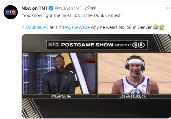 掘金击败快船赛后,戈登接受TNT的采访,韦德表示只有一个问题要问,他问戈登为什么改穿掘金50号球衣?戈登面带笑容回应老前辈:你知道我在扣篮大赛中拿到了最多的50分。