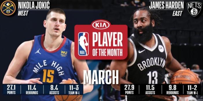 来源:24直播网04-02 14:4724直播网讯北京时间4月2日,NBA官方公布三月月最佳球员,最终掘金的约基奇和哈登当选,带队的战绩以及个人数据都无可挑剔!