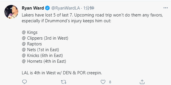 詹姆斯、浓眉还在养伤,新援庄神也伤了,湖人三巨头全受伤,接下来将遭遇七连客的魔鬼赛程,对手包括快船、篮网、尼克斯和黄蜂等季后赛级别的球队;湖人排名西部第四,但仅仅领先开拓者和掘金0.5个胜场,恐怕西部第四是保不住了。