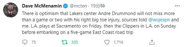 来源:24直播网04-02 11:5324直播网讯 湖人新援庄神最新伤情出炉,据湖人记者Dave McMenamin报道,湖人内部乐观估计,德拉蒙德最多缺席1-2场,上一场对阵雄鹿,庄神首秀仅打14分钟便因伤退赛,伤情确诊为脚趾挫伤,受伤离场前6投2中拿到4分2助攻1盖帽1篮板。