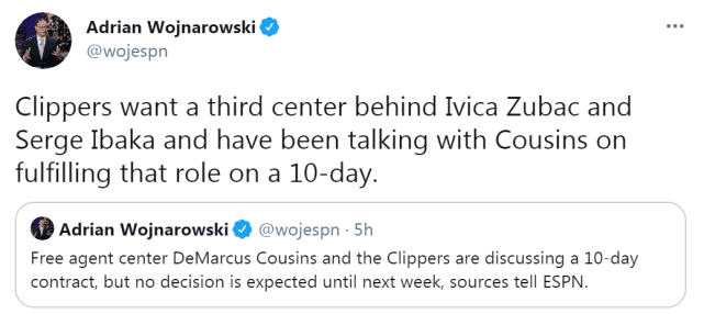 沃纳罗斯基还报道称,快船需要一位在祖巴茨和伊巴卡之后的第三中锋,他们打算让考辛斯扮演这个角色。这着实令人唏嘘,身为4届全明星,考辛斯被伤病多次困扰,他在联盟中的地位也每况愈下。之前在火箭,他好歹是伍德的替补,而现在去快船,他只能打替补的替补。