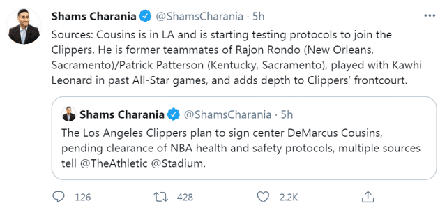 来源:24直播网04-01 17:1324直播网讯北京时间4月1日,ESPN名记沃纳罗斯基报道称,自由球员考辛斯和快船讨论签下一份10天合同,预计在下周正式做出决定。The Athletic名记查拉尼亚报道称,考辛斯正在洛杉矶接受NBA的健康安全协议检测,预计通过后和快船签约,他能提升快船的阵容深度。此前,凯尔特人也有计划引进考辛斯,但看来考辛斯更想重回洛杉矶。