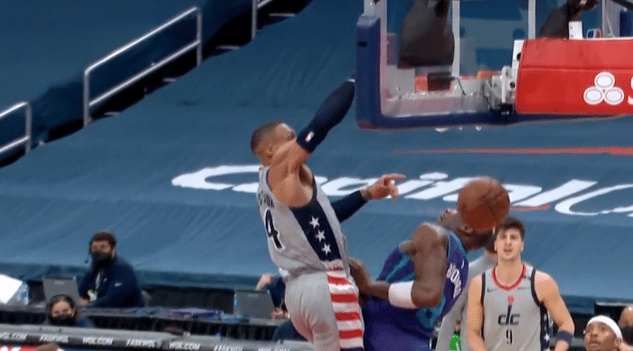 末节马丁突破打进,小洛佩兹连续三次低位勾手打进,泽勒二次进攻抛投命中,洛佩兹二次进攻补篮回应,杰罗姆罗宾逊反击补篮也进,威少妙传八村塁单臂暴扣,然后自己再攻守转换打板中投,罗齐尔连拿4分,海沃德造犯规,罗齐尔飙进三分杀死比赛,威少隔扣比永博,最终黄蜂114:104击败奇才!