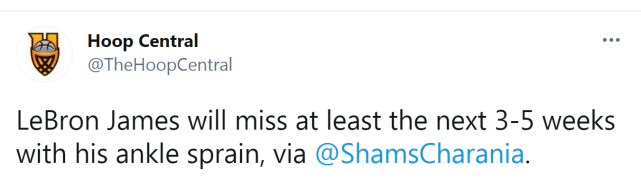 来源:24直播网03-31 15:0424直播网讯北京时间3月31日,据名记查拉尼亚报道,勒布朗-詹姆斯由于脚踝的伤势将至少继续缺席3-5周的比赛。如果詹姆斯缺席5周,按目前的时间来看,就是要休战到5月初,届时距离季后赛开战大概只有半个月左右的时间了。