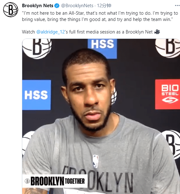阿德表示,他和马刺确定分手之后,一直都在训练保持身材;谈到在篮网阵容中扮演的角色,阿德表示:我想用我的防守智商,换防能力和沟通能力来帮助篮网提升防守,我来这儿不是来当全明星的,这不是我想做的。我想努力带来价值,带来我擅长的东西,努力帮助球队获胜。