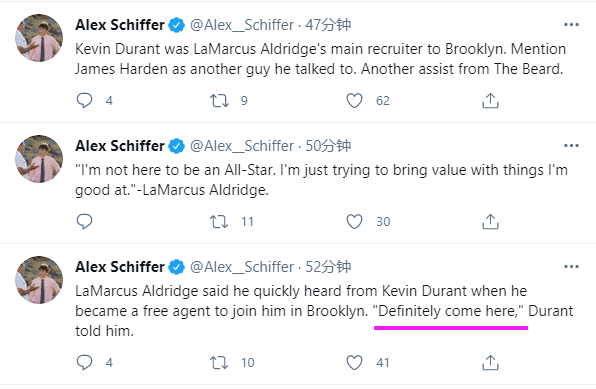 据篮网记者Alex Schiffer报道,阿德表示他成为自由球员后,杜兰特很快就给他发消息,杜兰特告诉他:一定要来这里;杜兰特是招募阿德最积极的球星,另外一位招募阿德的球星是哈登,哈登也找阿德交谈,为篮网引援阿德贡献一份力量。