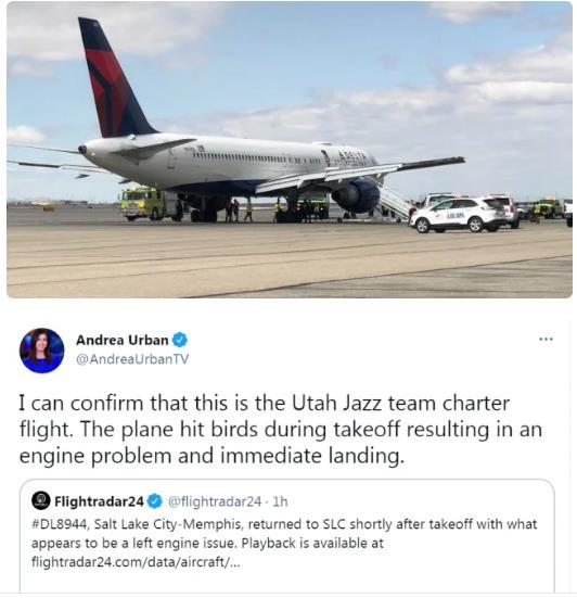 爵士队为何会遭遇如此惊险的一幕呢?事后,著名篮球记者WOJ跟进了事件,根据WOJ的爆料,飞机在起飞后几分钟后就撞倒了一群飞鸟,在空中和飞鸟碰撞,绝对不是一件好玩的事情,这次相撞让飞机的引擎受到了严重的损坏,落地后的飞机机头上也是斑斑血迹,但是所幸的是事情虽然惊慌,但是没有造成人员受伤。