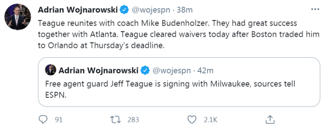 雄鹿通过签约蒂格,进一步提升了后场的深度。他们之前还通过交易得到火箭的塔克。篮网本赛季兵强马壮,雄鹿自然也要尽力补强。目前,雄鹿29胜16负,排名东部第三,仅次于费城和篮网。他们在一波8连胜后遭遇2连败,连续输给凯尔特人和尼克斯。