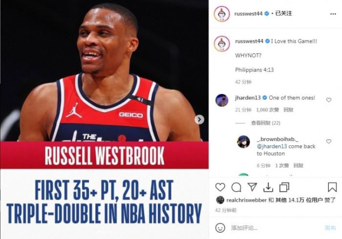 韦少晒神迹:我爱比赛,为什么不呢?哈登在评论区留言:最佳之一。