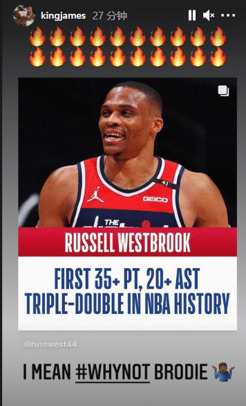 36岁詹姆斯正在养伤,仍旧不耽误凑热闹,在社交媒体上转发韦少轰下35+20历史唯一三双的神迹,配上20个火的表情,并且写道:我懂你,为什么不呢,兄弟(摊手表情)。
