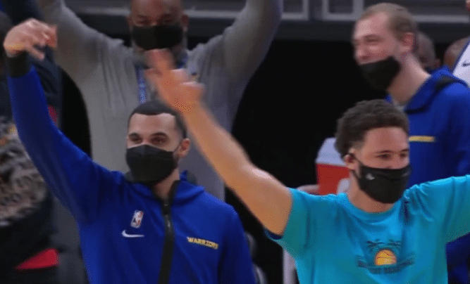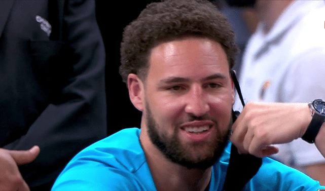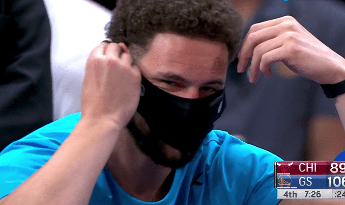 这是末节勇士已经将分差拉大到将近20分,几乎提前锁定胜局,场边的克莱心情也很好,他摘下了口罩,镜头也随之对准了他,球迷们很快就吐槽,称克莱真的胖了,他的脸都圆了很多。不知道是不是听到了球迷们的吐槽,短暂摘下口罩的克莱很快就又戴上了,然后镜头给到比赛场内。