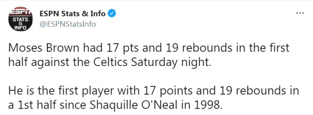 值得一提的是这只是摩西-布朗NBA生涯的第25场比赛。过去6场比赛,布朗有5场篮板上双,对公牛一战抢下16个篮板,对森林狼一战抢下18个篮板,如今对凯尔特人,他又抢下23个篮板。这位身高2米18的中锋,已经在联盟里渐入佳境。