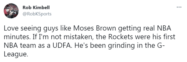Kimbell没记错,火箭曾签约摩西-布朗,让他随队出战2019年夏季联赛,但最终并没有留用他。看到摩西-布朗如今的表现,不知道火箭高层会不会有点后悔。这位落选秀,用表现证明了自己的价值。
