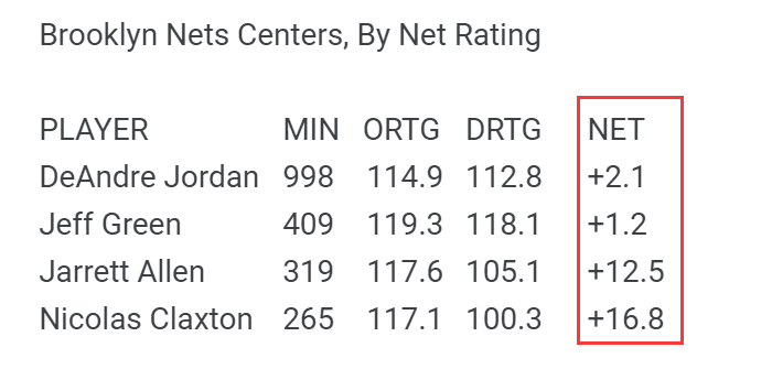 先来看一组数据,篮网赛季至今在中锋位置上使用时间超过200分钟的球员一共有4位:小乔丹998分钟,杰夫-格林409分钟,已经被交易的阿伦319分钟,克拉克斯顿265分钟。当这四位打中锋时,进攻防守效率如何一目了然。