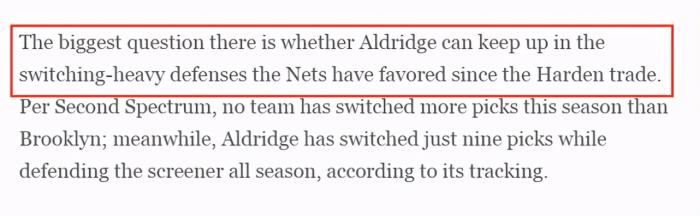 来源:24直播网03-29 16:1824直播网讯 北京时间3月28日,阿尔德里奇正式决定加盟篮网,理由很简单,这支球队有更大的冲冠希望。问题是这位35岁的全明星是否完美匹配篮网呢?ESPN数据专家凯文-佩尔顿对此进行解析,在他看来,阿德的技术特点有适合篮网的地方,但他要想做出自己的贡献,同样需要解决一个问题。