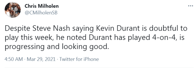 另外,纳什还透露了杜兰特的最新恢复情况。据纳什透露,杜兰特不大可能在这一周复出,但他的康复继续取得进展,他已经能参加4v4的对抗训练,而且表现不错。这意味着杜兰特很有可能至少再缺席一周的比赛。