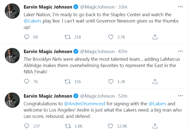 约翰逊还点评了竞争对手篮网的情况。“篮网已经是最有天赋的球队……阿德的加入让他们更让他们足以代表东部参加总决赛。”看来,约翰逊已经非常期待看到湖人和篮网在总决赛上的较量了。他还表示希望湖人主场能尽快允许入场看球,他已经迫不及待想要去现场了。