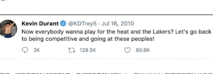 当时杜兰特的这条动态是在詹姆斯宣布加盟热火之后几天发布的,所以很显然他是鄙视抱团的,因为那个时候的詹姆斯被外界抨击是去迈阿密抱团冲击总冠军。