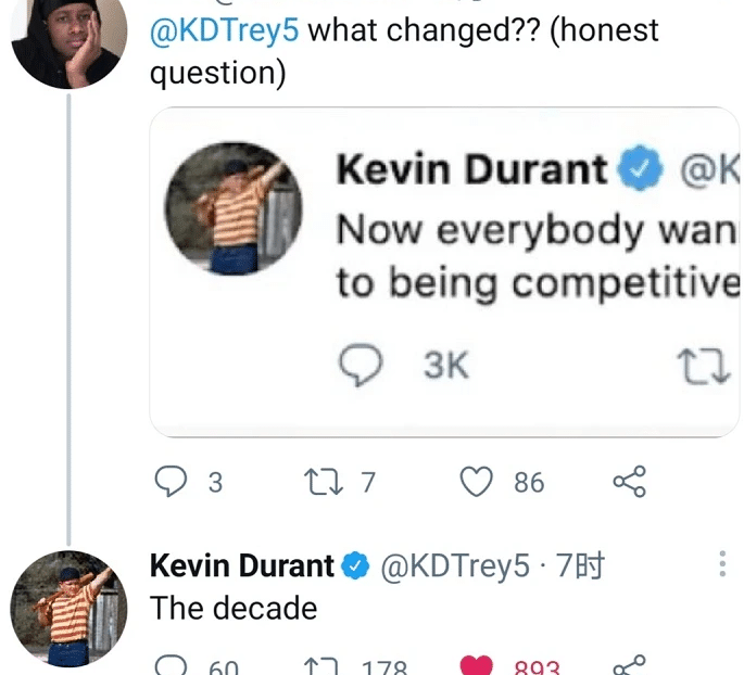 后期杜兰特还回复过球迷们的质疑,他表示“The decade”也可以理解为时间可以改变一切,等于就是说现在的杜兰特和当时的心情已经是不同的了。