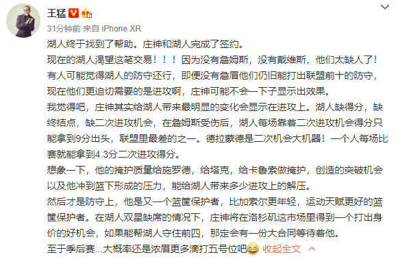 知名篮球人王猛也在社交媒体上进行点评,他主要从进攻和防守两个层面上进行解读,称现在来到湖人的庄神是可以在进攻端给球队更多的帮助,尤其是二次进攻方面,他的一个人每场比赛就能拿到4.3分二次进攻得分,而在没有詹姆斯和浓眉哥的情况下,湖人的场均二次进攻得分只有9分出头,联盟最差之一,所以庄神到来之后进攻端会有好转。防守端篮筐保护者的能力不用太多的质疑,数据也已经摆在那里。最后王猛还表示,如果“如果能帮湖人守住前四,那定会有一份大合同等待着他”。