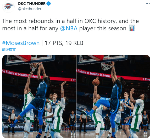 第一、摩西-布朗半场19个篮板是雷霆队史半场最高纪录,也是本赛季联盟半场最高纪录。