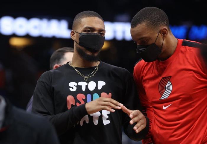 本场比赛面对魔术,利拉德因左膝挫伤缺席比赛。比赛刚刚开始不到5分钟的时间,现场镜头给到了坐在场边观战的利拉德。利拉德戴着口罩,上身穿了一件长袖,衣服上印着“STOP ASIAN HATE(停止仇恨亚裔)”几个大字,非常显眼。ESPN也在推特上晒出了利拉德身穿这件衣服的照片。
