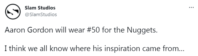 美媒SlamStudio晒出戈登在扣篮大赛上的画面以及他的个人纪录片《50分先生》,配文写道:“阿隆-戈登将在掘金穿上50号球衣,我认为我们都知道他的灵感来源……”当然,SlamStudio也没忘了配上韦德的经典表情。