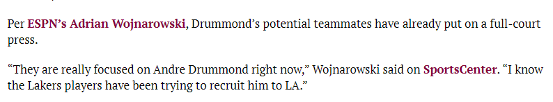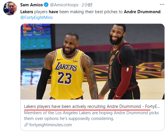 据报道,这段时间德拉蒙德一直在洛杉矶训练,而湖人是庄神潜在的热门下家,甚至可以说湖人领跑庄神争夺战;ESPN名记沃纳罗斯基在节目中爆料:湖人球员已经开始招募德拉蒙德加盟湖人,他们现在真的很关注德拉蒙德。