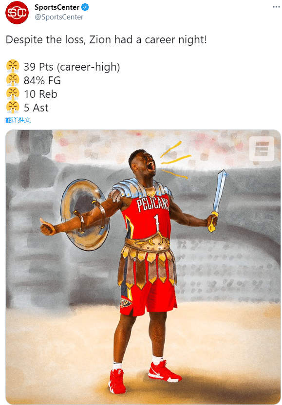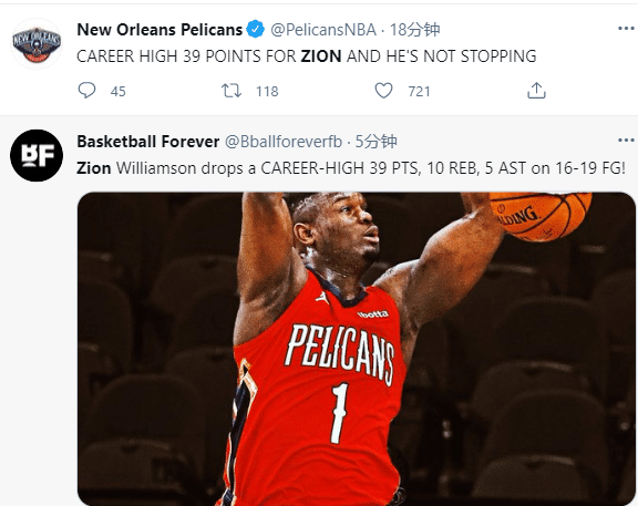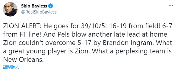 美媒Sports Center发推写道,尽管鹈鹕输了,锡安仍旧打出生涯之夜;名嘴贝勒斯怒了,发推写道:锡安警报!他19投16中肆虐禁区,轰下39+10+5,英格拉姆17投5中防住了锡安,锡安是一个伟大的年轻球员,可新奥尔良是一支多么令人困惑的球队啊。