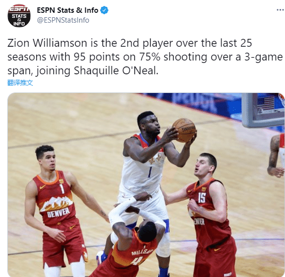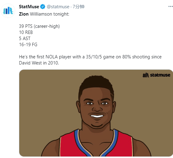 锡安轰下35+10+5且命中率80%,成为2010年大卫-韦斯特之后鹈鹕队史第一位打出如此表现的球员;锡安过去三场命中率至少75%轰下95分比肩奥尼尔成NBA近25年第二人;20岁胖虎疯狂爆发却遗憾输球引发热议,鹈鹕官方盛赞锡安不可阻挡,美媒晒特效图为锡安而失落。