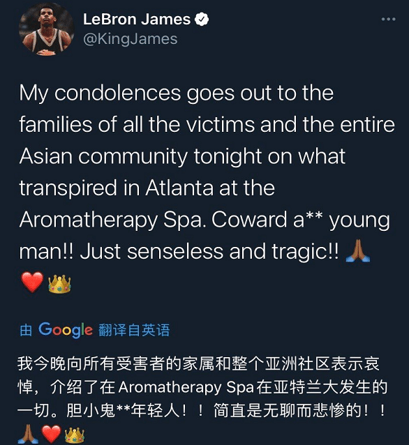 再加上当地很多的社会现象,所以声援亚裔的人越来越多,林书豪经常在社交媒体上声援“大家拧成一股绳,为改变而战”。后期詹姆斯、韦德等在篮球圈有着巨大影响力的人物也都为亚裔发声,林书豪也感谢对方的回应和支持。