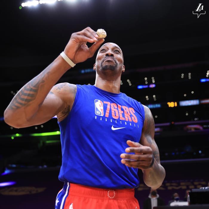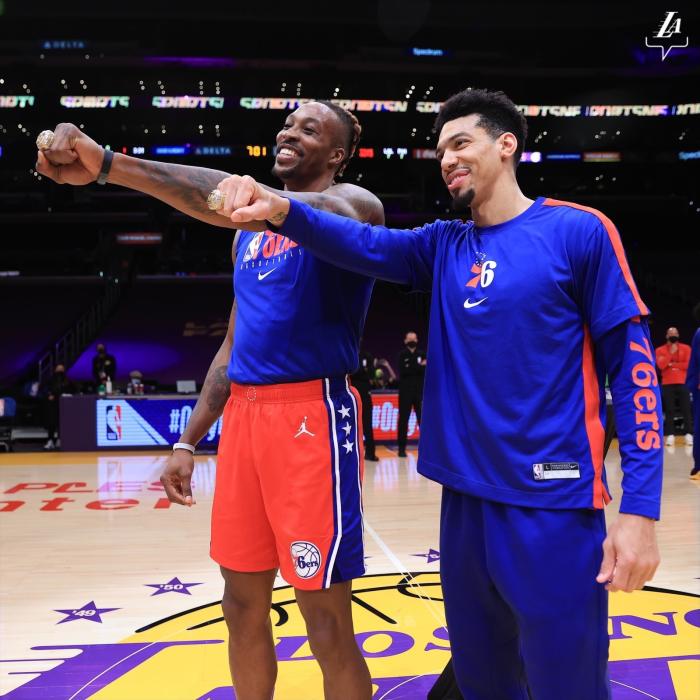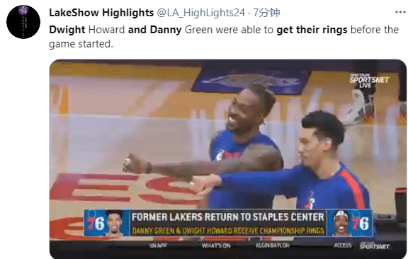 身披费城战袍重返斯台普斯球馆,霍华德和丹尼-格林都在赛前领取属于自己的总冠军戒指,两人都在现场戴上总冠军戒指,并且对着镜头炫耀一番,咧嘴大笑十分开心,霍华德更是深情亲吻戒指,动情一幕被拍下,真是快哭了;对于霍华德来说,在重返湖人的救赎赛季,他如愿随队夺得生涯首冠。