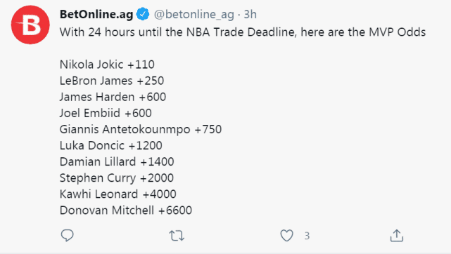 最新MVP赔率出炉!约基奇强势领跑,詹姆斯排名第二哈登升至第三