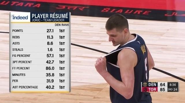 本赛季至今,约基奇的11项数据排名全队之首,包括得分、篮板、助攻、抢断、投篮命中率、三分命中率、罚球命中率、出场时间、PER效率值、助攻率。他在不在场,掘金的分差变化也是全联盟之首。