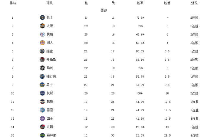 爵士目前处于连胜中,他们的战绩依旧是联盟最好的。太阳今天在布克的带领下击败了热火,球队迎来3连胜,势头不错。快船今天没有比赛任务,但因为湖人的输球,他们渔翁得利,升至第三名。湖人今天没有詹姆斯和浓眉哥的情况下输给鹈鹕,吃到3连败,球队表现很糟糕。掘金在约基奇三双的打响了击败了魔术,最近5战取得了4场胜利。开拓者对阵篮网,很遗憾他们输了球,利拉德和坎特全部空砍。马刺近期吃到2连败,据悉德罗赞也有被交易的可能性。独行侠战绩是22胜19负,他们想冲击直通季后赛的前六名还需要努力。
