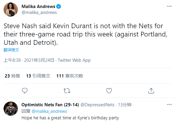 篮网主教练纳什表示,杜兰特处于伤病康复的最后阶段,随队出战客场毫无意义,现在最重要的是杜兰特重返赛场,他们不想冒险把事情搞砸;再加上欧文也离队,三连客期间看不到杜欧两兄弟;对此美球迷点评:希望杜兰特能在欧文的生日派对上玩得开心。