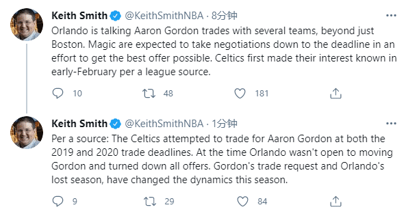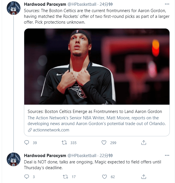据名记Keith Smith报道,目前凯尔特人和魔术正在谈判,绿军已经把戈登作为首要引援目标,魔术索要两个首轮选秀权和一名年轻球员,与此同时掘金也在积极引援戈登,掘金报价威尔-巴顿、波尔-波尔和选秀权,开拓者也有意戈登,但他们积极性补强。