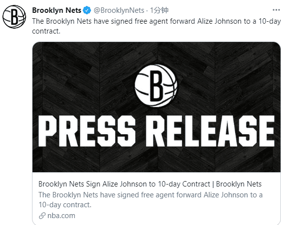 欧文暂时离队,沙梅特因伤无法出战,杜兰特、丁威迪也在养伤,篮网火速签下阿利兹-约翰逊,约翰逊在发展联盟场均轰下16.5分13.5篮板,双方签下10天短合同,预计约翰逊可以领到11万美元的薪水,最多可以打五场比赛。