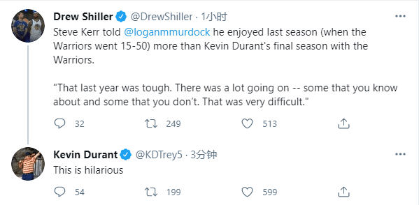 科尔享受上赛季,比杜兰特在勇士最后一年还要享受更多,对此杜兰特发推写道:这太可笑了。