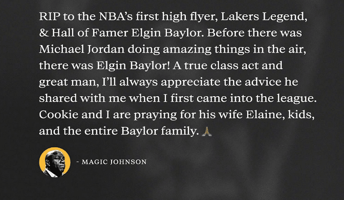 魔术师约翰逊:安息吧,NBA的飞翔者,湖人的传奇,名人堂的成员埃尔金-贝勒,在乔丹在空中做出那样动作之前,还有埃尔金-贝勒,他是一个真正的精英和伟人,我永远感激他在我刚进入联盟之后给我的建议,我和爱人为埃尔金-贝勒的爱人、孩子和他的家族祈祷。
