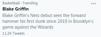 格里芬首秀14分57秒砍下2分2板1盖帽。正负值+12全场最高,在有限的时间内表现可圈可点,首先防守端足够努力,制造了比尔进攻犯规还送出了封盖!进攻端还没有融入球队,几次单打没有成功,但第四节开局的突破暴扣还是非常精彩的,他本人还在熟悉篮网进攻体系,别着急慢慢来!