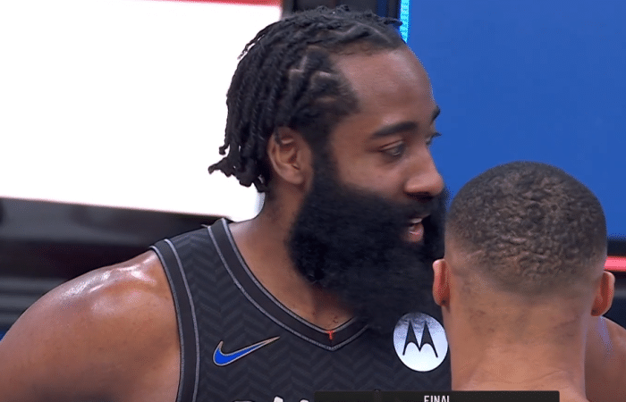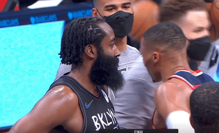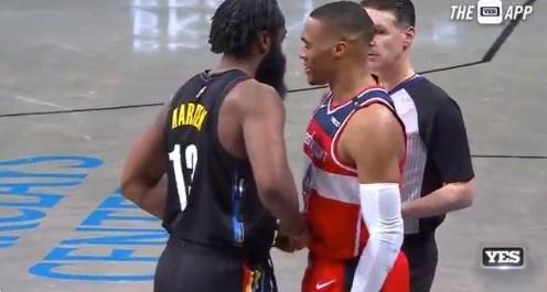 哈登和威少这对昔日兄弟则站在场地上聊了很久,其实在比赛中两人就在裁判的“注视下”完成了秀恩爱,哈登和威少凑在一起勾手指并且相视一笑!赛后也是站在一块聊了好久,值得一提的是此前篮网两败奇才,哈登还都没来到球队,所以这算是篮网哈登与威少的首次碰面!