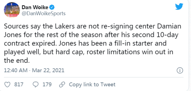 琼斯没能留队,倒是让不少人感到意外。毕竟,琼斯在两份10天合同期间表现不错,特别是对篮下机会的把握能力不错,数据显示,琼斯累计为湖人打了8场比赛,17投16中,投篮命中率高达94.1%,一共拿下43分26篮板7盖帽。琼斯的离队,会让湖人的内线深度出现一些问题,但湖人高层显然是从长远角度出发,做出了这个艰难的决定。