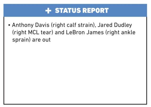 伤病方面,并没有出乎大家的意料。詹姆斯的具体伤停时间没有出炉,但他很难在短期内复出,此前有记者指出类似伤病的联盟平均休战时间是10场比赛。浓眉距离复出还有一段时间,而杜德利韧带撕裂,很可能长期缺阵。