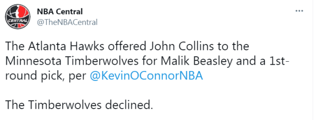 老鹰依然在试图送走约翰-科林斯,之前他拒绝了老鹰的续约。奥康纳报道称,老鹰曾向森林狼提出一份报价,就是送出科林斯,得到马利克-比斯利和一个首轮签,但森林狼拒绝了这份报价。赛季至今,科林斯场均18.2分7.8篮板,比斯利场均20.5分4.6篮板2.5助攻。