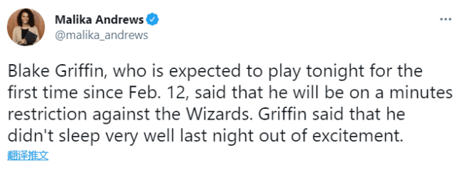格里芬表示:“非常兴奋,真的非常兴奋。我昨晚甚至都没有睡个好觉,这可能是我感觉兴奋的最好表现。来到新的环境,新的球队,我真的感觉很兴奋。”此外,格里芬还表示自己对阵奇才的比赛,将有上场时间限制。不过总而言之,格里芬的篮网首秀就要来了。