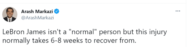 湖人记者Markazi发推写道:“詹姆斯不是凡人,但这种伤病通常也需要6-8周时间去康复。”