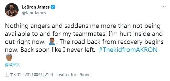 詹姆斯没有接受赛后采访,但他第一时间更新社媒:“没有什么比不能上场以及和队友们一起更让我生气和难过了,我现在身心都感到受伤。恢复之路从现在开始,我会很快回来,就像从未离开。”